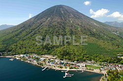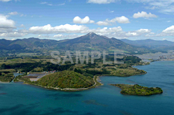 | こちらは、猪苗代湖の西北側上空から、左側に翁島を配した磐梯山と、そのふもとの新緑風景です。 |
