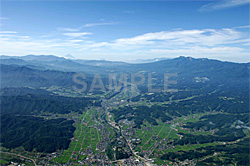 | 緑の美しい田園地帯の佐久盆地上空から、左遠方に富士山、右手に八ガ岳を収めました。 |